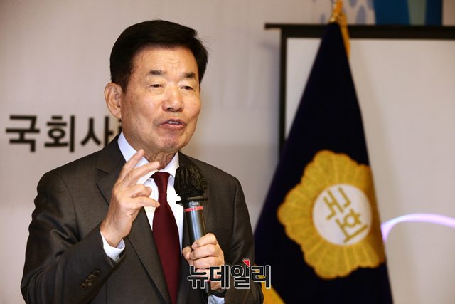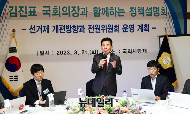 김진표 국회의장이 21일 국회 사랑재에서 열린 '선거제 개편방향과 전원위원회 운영계획' 정책설명회에서 발언을 하고 있다.