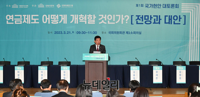 김진표 국회의장이 21일 오전 국회 의원회관에서 열린 제1회 국가현안 대토론회 '연금제도 어떻게 개혁할 것인가' 토론회에서 축사를 하고 있다.