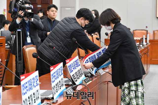 '대한민국 미래를 위한 결단 여야 함께 합시다' 팻말이 21일 오전 국회에서 열린 운영위원회 회의실 국민의힘 의원들 자리에 붙어 있다.