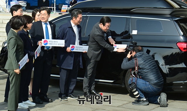 이재명 더불어민주당 대표가 22일 국회 본청 앞에서 열린 대일굴종외교 규탄 태극기달기 운동 행사에서 자신의 차량에 '역사를 팔아서 미래를 살 수는 없습니다' 문구의 스티커를 붙이고 있다.
