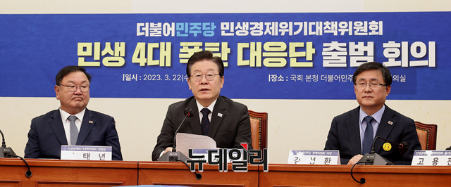 이재명 더불어민주당 대표가 22일 국회에서 열린 민생 4대 폭탄 대응단 출범회의에서 발언하고 있다.