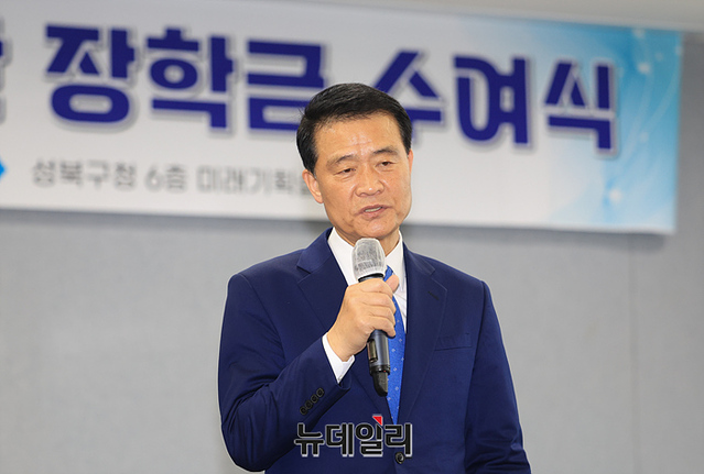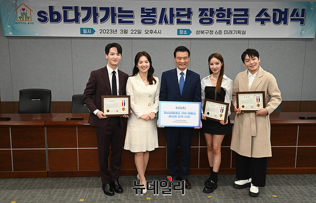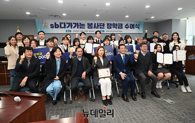 이승로 성북구청장과 수상자들이 22일 오후 서울 성북구청에서 열린 sb다가가는봉사단 장학금 수여식에서 기념촬영을 하고 있다.