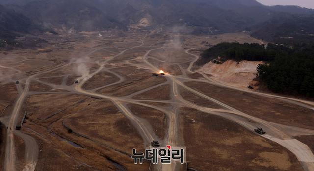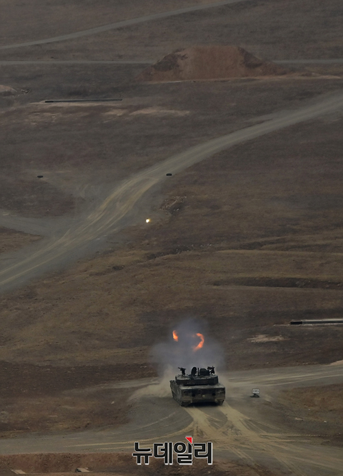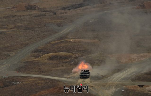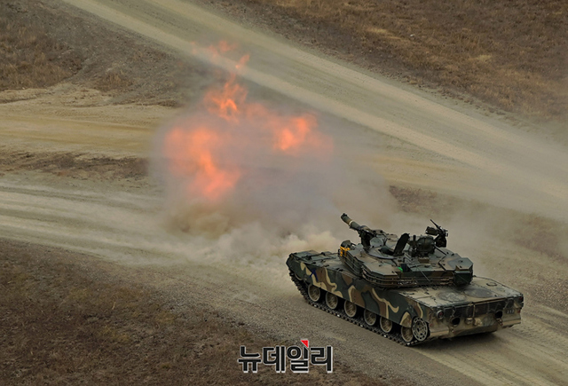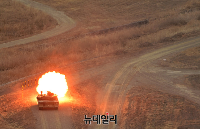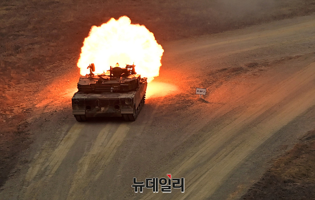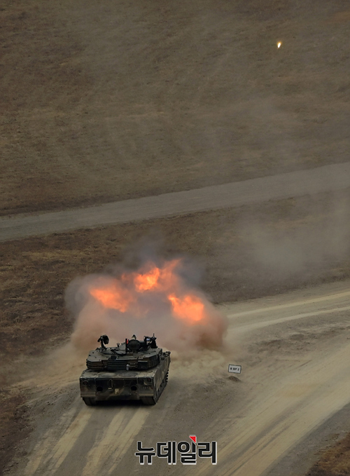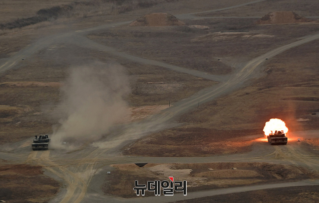 육군수도기계화보병사단의 K1A2전차가 22일 오후 경기 포천시 로드리게스 훈련장에서 열린 한미연합 제병협동사격에서 전술기동을 하며 사격을 하고 있다.