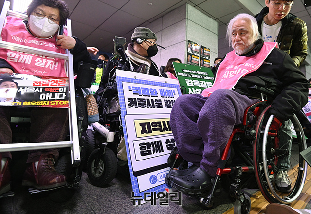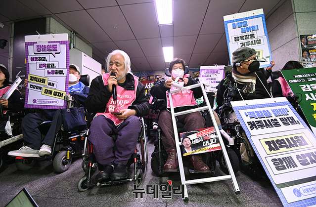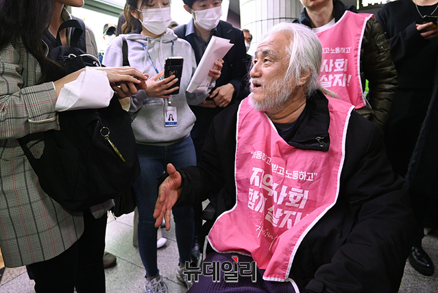 박경석 전국장애인차별철폐연대 대표가 23일 오전 서울 1호선 시청역 환승통로에서 시위를 진행하고 있다.