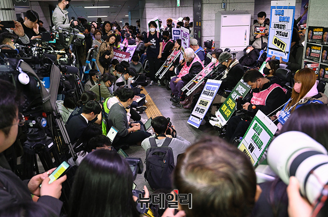 [포토] 전장연, 1호선 시청역서 시위 재개