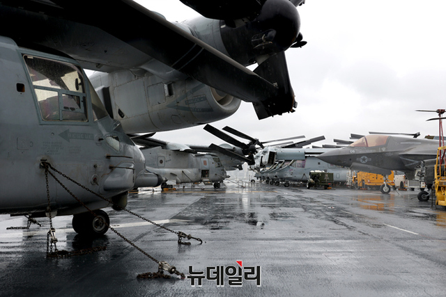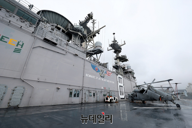 한미연합 상륙훈련인 쌍룡훈련을 위해 23일 부산 해군작전사령부에 정박한 와스프급 강습상륙함 '마킨 아일랜드함'에 MH-60 시호크, 수직 이·착함 기능이 있는 F-35B 스텔스 전투기 등이 주기돼 있다. (사진=공동취재단)