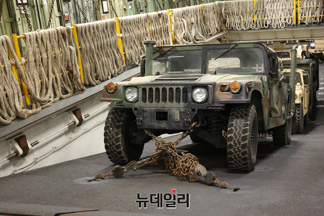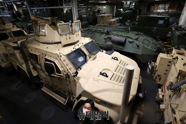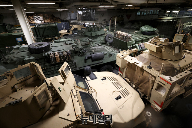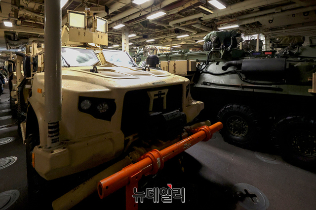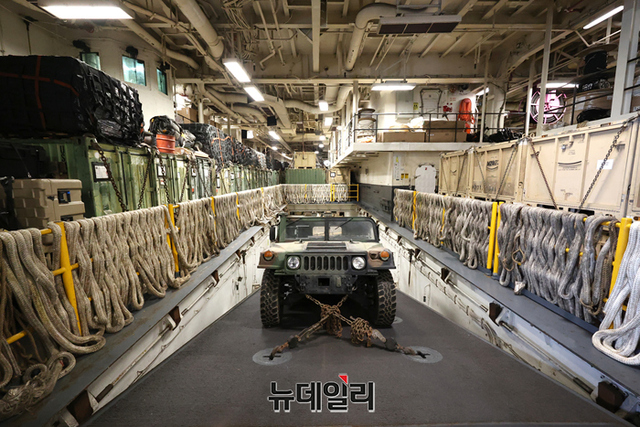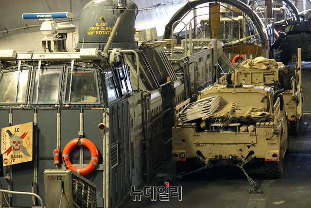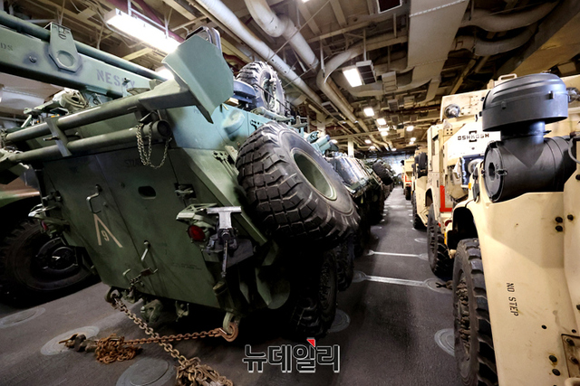 한미연합 상륙훈련인 쌍룡훈련을 위해 23일 부산 해군작전사령부에 정박한 와스프급 강습상륙함 '마킨 아일랜드함'에 상륙작전에 필요한 전투 장비가 주차돼 있다. (사진=공동취재단)