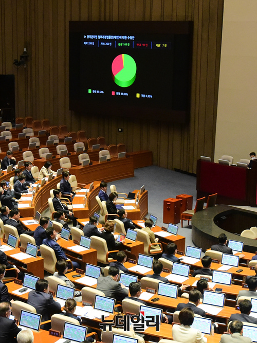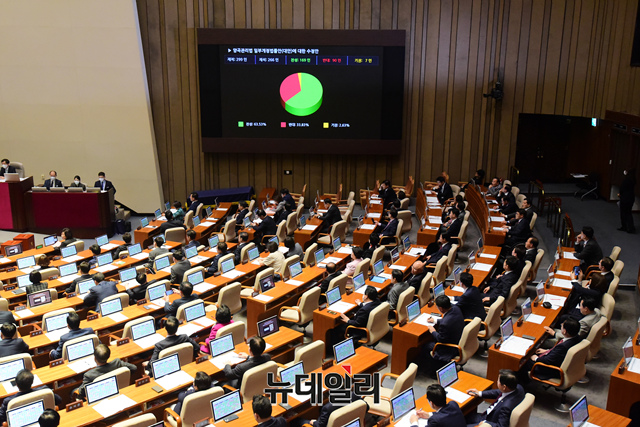 양곡관리법 일부개정법률안(대안)에 대한 수정안이 23일 국회에서 열린 본회의에서 재석 266인, 찬성 169인, 반대 90인, 기권 7인으로 가결되고 있다.
