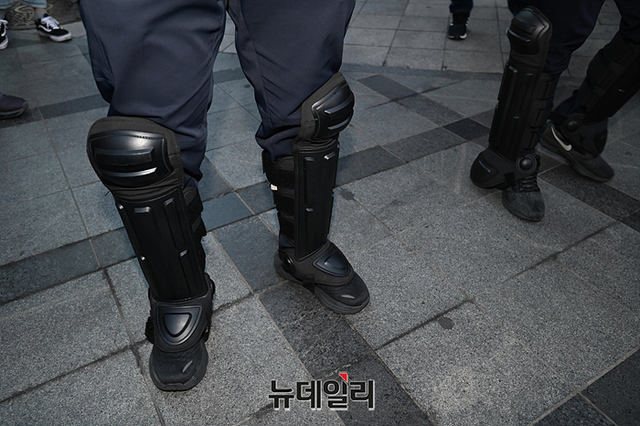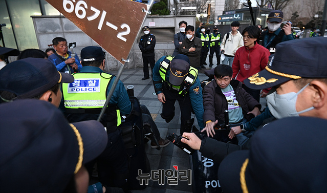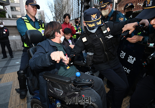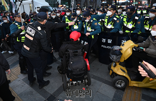 지하철 탑승시위를 재개한 전국장애인차별철폐연대가 23일 오후 서울광장 인근 도로에서 경찰과 대치하고 있다.