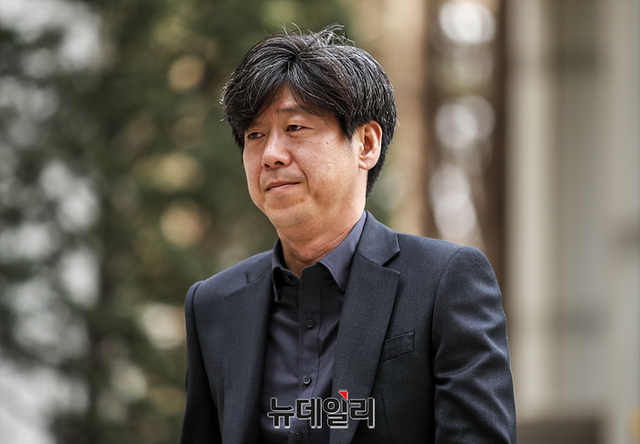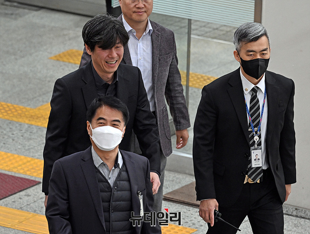 남욱 변호사가 24일 오전 서울 서초구 중앙지방법원에서 열린 특정범죄가중처벌등에관한법률위반 공판에 출석하고 있다.