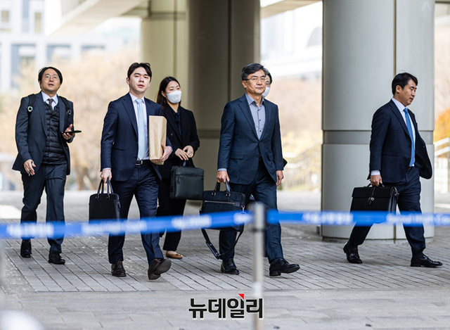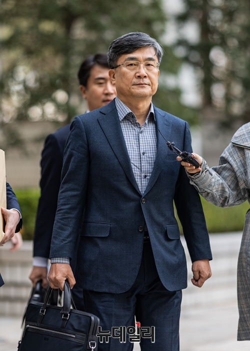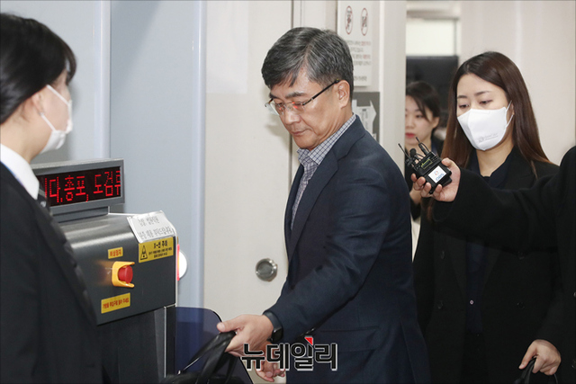 서해 공무원 피격 사건을 은폐하려 한 혐의로 기소된 서욱 전 국방부 장관이 24일 서울 서초구 중앙지방법원에서 열린 1차 공판에 출석하고 있다. (사진=공동취재단)