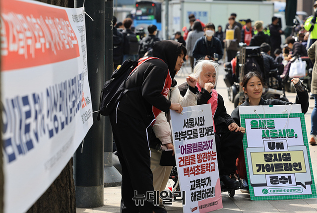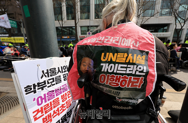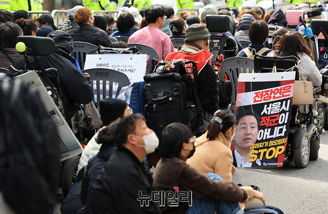 최근 출범한 420장애인차별철폐공동투쟁단이 24일 오전 서울시청 인근 도로에서 전국장애인대회를 앞두고 열린 집회에서 발언하고 있다.