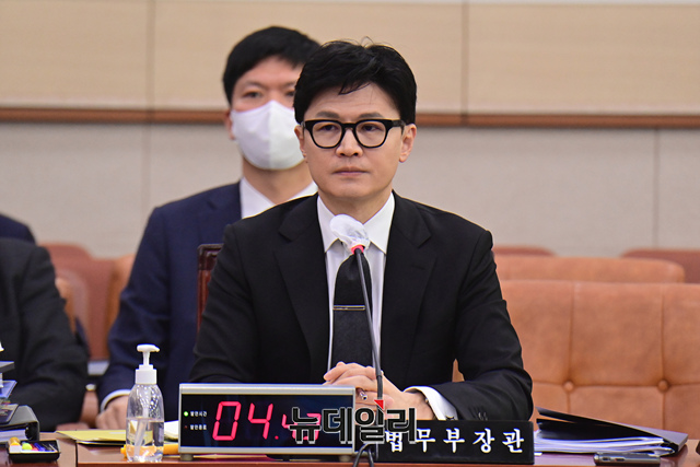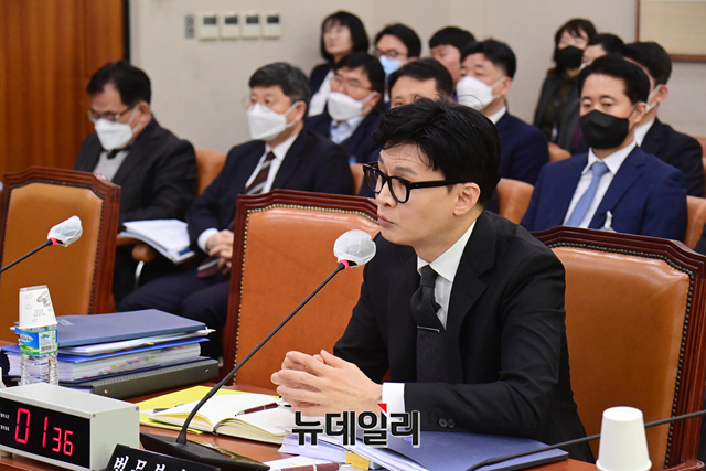 한동훈 법무부 장관이 27일 오전 국회에서 열린 법제사법위원회 전체회의에 출석해 의원들의 질문에 답하고 있다.