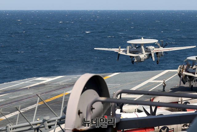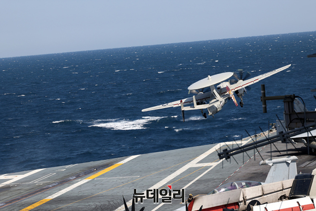 27일 제주도 남방 공해상에서 '전사의 방패(WS)' 한미연합훈련을 진행하고 있는 미국 항공모함 니미츠함(CVN-68·10만t급)에서 호크아이가 이함 준비를 하고 있다. (사진=공동취재단)