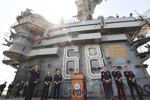 크리스토퍼 스위니 미국 11항모강습단장이 28일 오후 부산 해군작전사령부에 정박중인 핵추진 항공모함 니미츠(CVN-68)갑판에서 열린 기자간담회에서 취재진 질문에 답하고 있다. (사진=공동취재단)