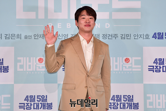 배우 안재홍이 28일 오후 서울 CGV 용산아이파크몰에서 열린 영화 '리바운드(감독 장항준)' 언론시사회에서 포즈를 취하고 있다. 4월 5일 극장 개봉.