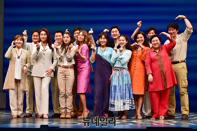 뮤지컬 '맘마미아!' 출연배우들이 29일 오후 서울 중구 충무아트센터 대극장에서 열린 프레스콜에서 기념촬영을 하고 있다.