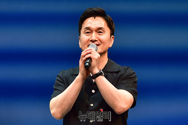 배우 장현성이 29일 오후 서울 중구 충무아트센터에서 열린 뮤지컬 '맘마미아!' 프레스콜에서 인사말을 하고 있다.