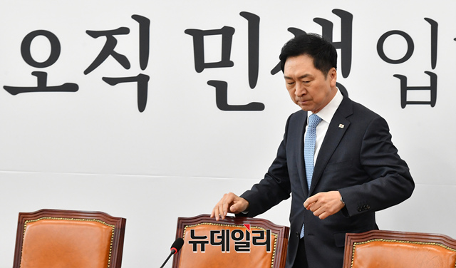 김기현 국민의힘 대표와 지도부가 30일 오전 국회에서 열린 최고위원회의에 참석하기 위해서 입장하고 있다.
