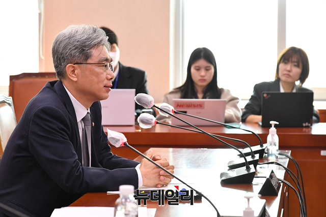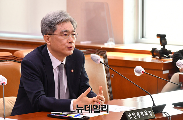 김상환 법원행정처장이 30일 오전 국회에서 열린 법제사법위원회 전체회의에 출석해 의원들의 질문에 답하고 있다.