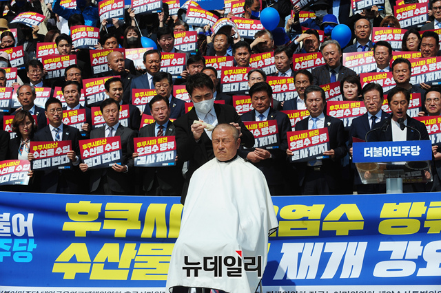 윤재갑 더불어민주당 해양수산특별위원회 위원장이 30일 오전 국회 본관 앞 계단에서 열린 후쿠시마산 수산물 수입 반대 및 대일 굴욕외교 규탄대회에서 삭발을 하고 있다.