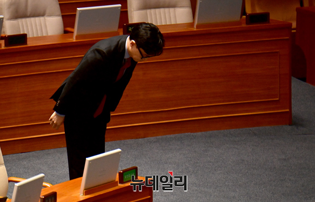 한동훈 법무부 장관이 30일 오후 국회에서 열린 본회의에서 하영제 국민의힘 의원의 체포동의요청 이유설명을 위해 단상으로 향하고 있다.