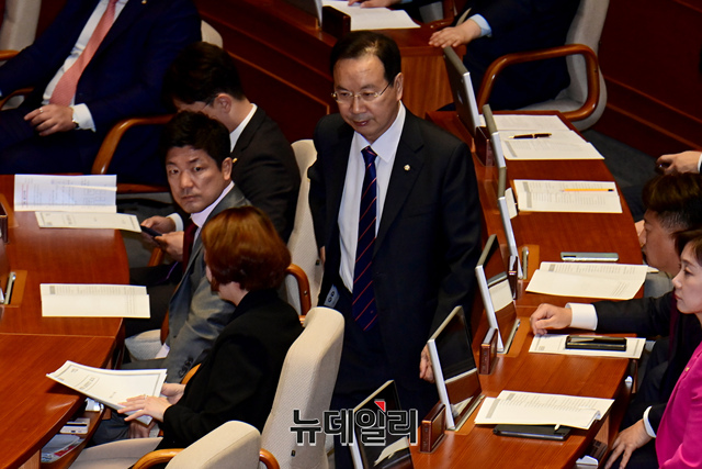 하영제 국민의힘 의원이 30일 오후 국회에서 열린 본회의에서 자신에 대한 체포동의안 관련 신상 발언을 마치고 자리로 향하고 있다.