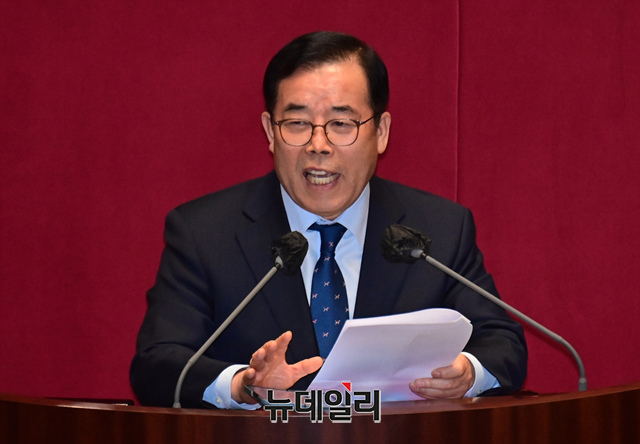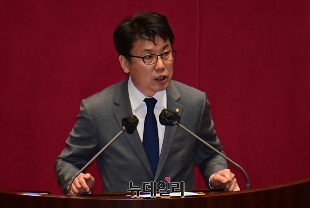 박성중 국민의힘 과학기술정보방송통신위원회 간사가 30일 오후 국회에서 열린 본회의에서 방송통신위원회 위원 최민희 추천안에 관련 의사진행발언을 하는 중 진성준 더불어민주당 원내수석부대표가 항의하고 있다.