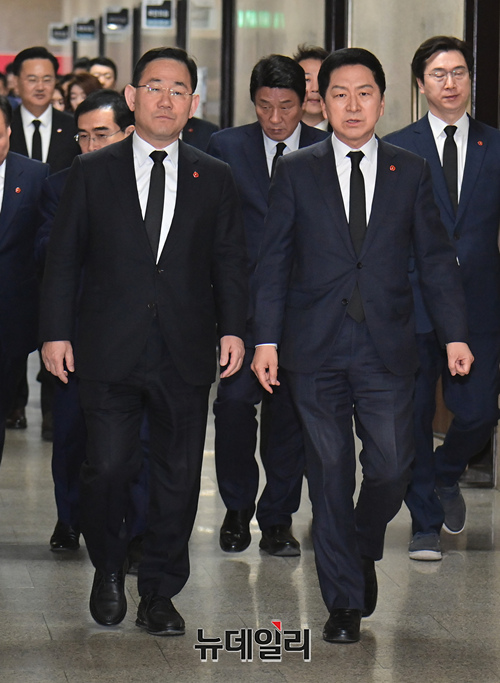 김기현 국민의힘 대표와 지도부가 3일 국회에서 열린 최고위원회의에 참석하기 위해 입장하고 있다.