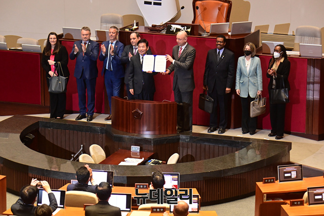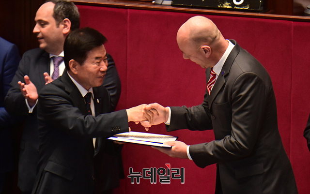 김진표 국회의장이 3일 오후 국회 본회의에서 국제박람회기구(BIE) 실사단장인 파트릭 슈페히트 행정예산위원장과 실사단에게 '2030 부산 세계박람회 성공적 유치 및 개최를 위한 결의안'을 전달하고 있다.