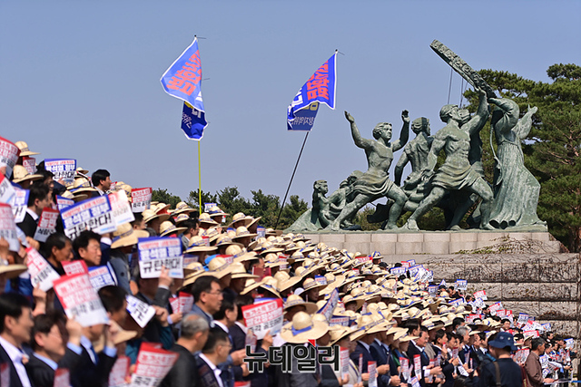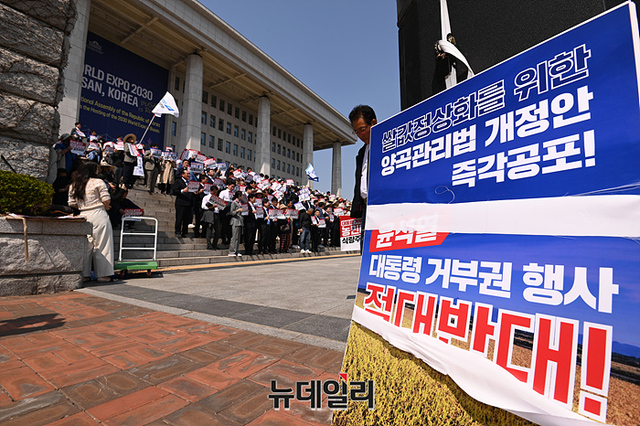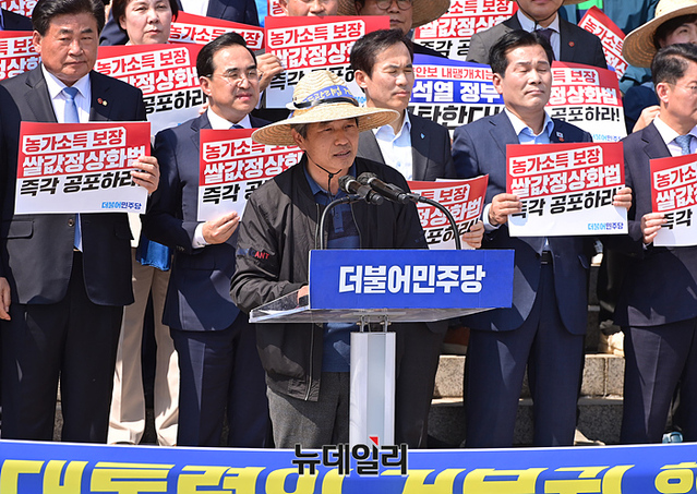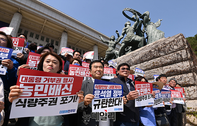 더불어민주당과 농민단체 대표들이 3일 오후 국회 본청 계단에서 열린 '쌀값 정상화법 공포 촉구 결의대회'에서 정부를 규탄하는 성명을 발표하고 있다.