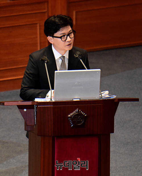 한동훈 법무부 장관이 3일 국회에서 열린 본회의 정치·외교·통일·안보에 관한 대정부 질문에서 의원들의 질문에 답하고 있다.