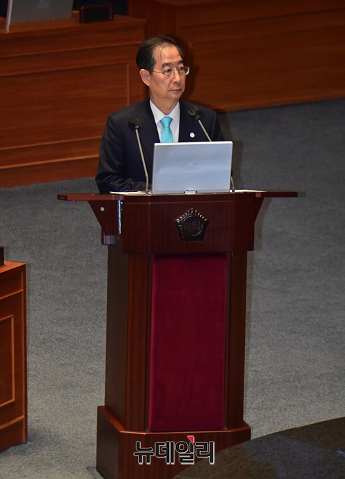 한덕수 국무총리가 3일 국회에서 열린 본회의 정치·외교·통일·안보에 관한 대정부 질문에서 의원들의 질문에 답하고 있다.