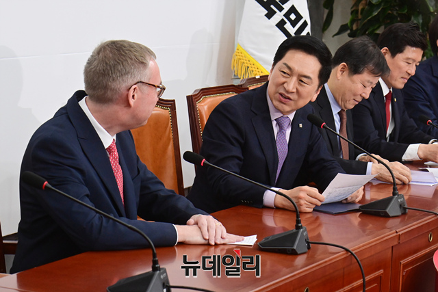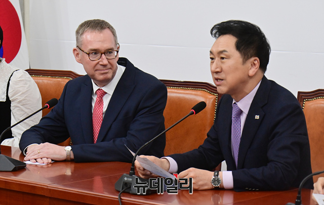 김기현 국민의힘 대표가 5일 오전 국회에서 콜린 크룩스 주한 영국대사를 접견하고 환담을 나누고 있다.