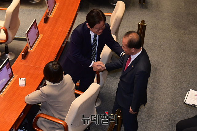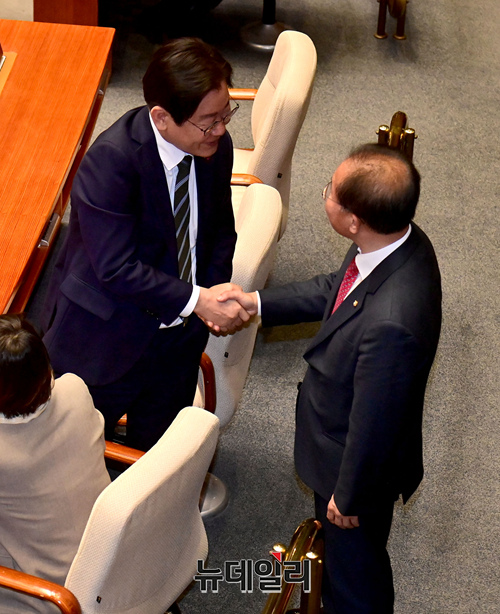이재명 더불어민주당 대표와 윤재옥 국민의힘 원내대표가 10일 오후 국회 본회의장에서 열린 국회의원 선거제도 개선에 관한 결의안 심사를 위한 전원위원회에서 인사를 하고 있다.