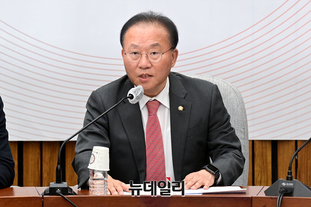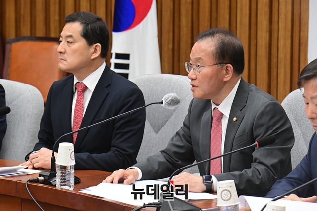 윤재옥 국민의힘 원내대표가 11일 오전 국회에서 열린 원내대책회의에서 발언하고 있다.