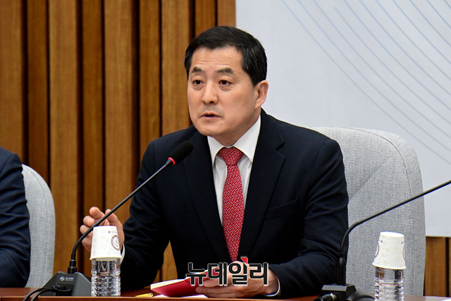 박대출 국민의힘 정책위의장이 11일 오전 국회에서 열린 원내대책회의에서 발언하고 있다.