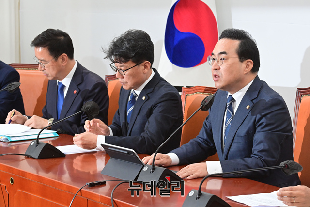 박홍근 더불어민주당 원내대표가 11일 오전 국회에서 열린 원내대책회의에서 발언하고 있다.