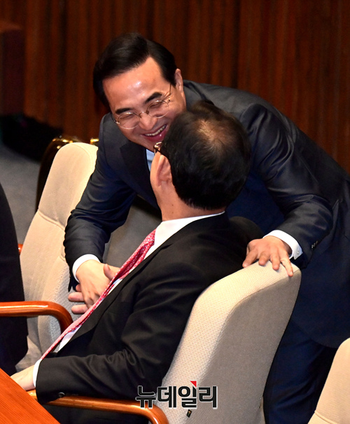 [포토] 본회의장서 인사 나누는 박홍근·주호영