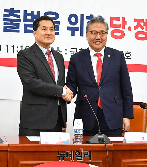 [포토] 기념촬영 하는 박대출 정책위의장과 박진 장관
