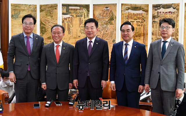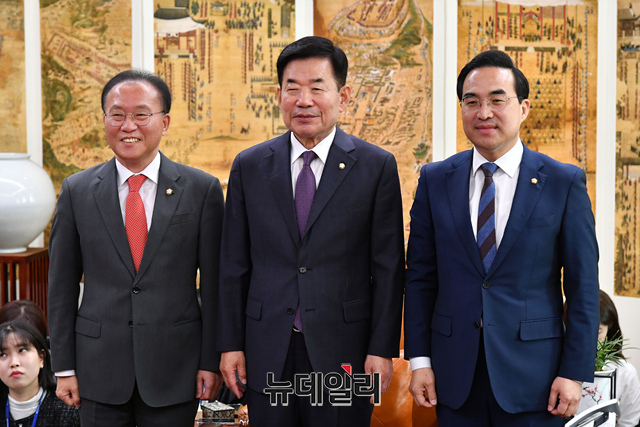 김진표 국회의장과 윤재옥 국민의힘 원내대표, 박홍근 더불어민주당 원내대표가 12일 오전 국회에서 국회의장 주재 교섭단체 원내대표 회동에 앞서 기념촬영을 하고 있다.