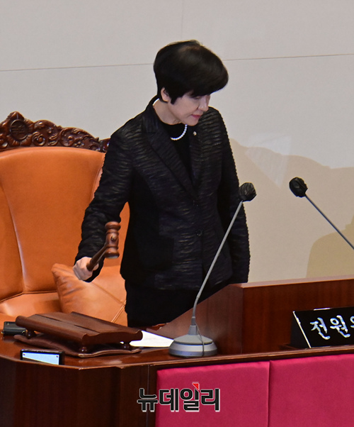 김영주 전원위원장이 12일 오후 국회에서 열린 국회의원선거제도개선에관한결의안심사를위한전원위원회에서 의사봉을 두드리고 있다.