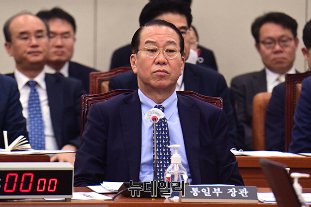 권영세 통일부 장관이 12일 국회에서 열린 외교통일위원회 전체회의에서 의원들의 질의를 듣고 있다.