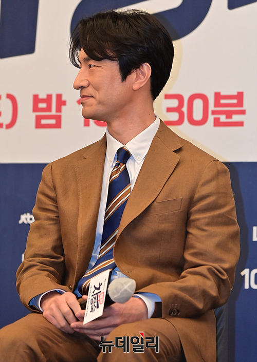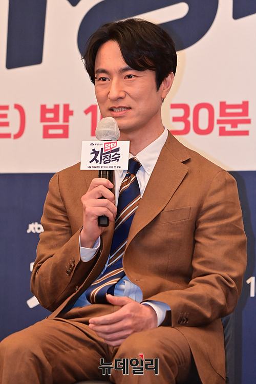 배우 김병철이 13일 오후 서울 강남구 조선팰리스에서 열린 JTBC 신규 토일드라마 '닥터 차정숙' 제작발표회에서 발언하고 있다.