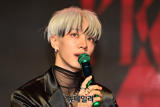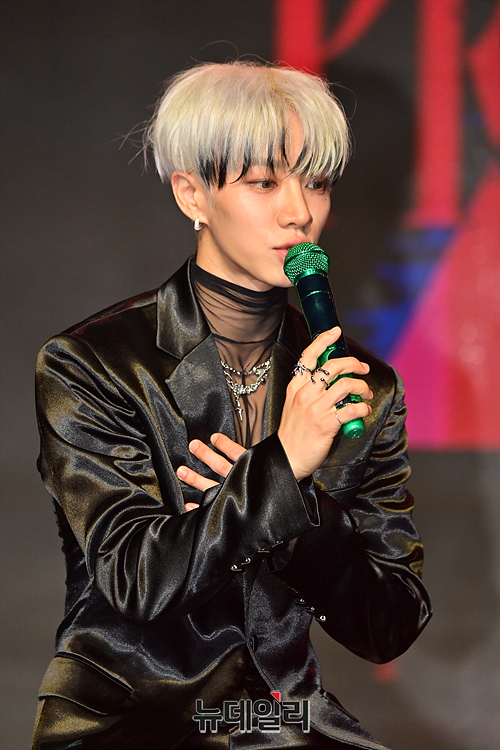 가수 이기광이 17일 오후 서울 강남구 일지아트홀에서 열린 첫 번째 솔로 정규앨범 'PREDATOR(프레데터)' 쇼케이스에서 앨범을 소개하고 있다.