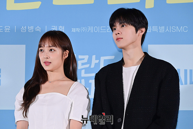 배우 김보라와 김우석이 19일 오전 서울 성동구 메가박스 성수점에서 열린 드라마 '핀란드 파파' 제작발표회에서 포토타임을 갖고 있다.