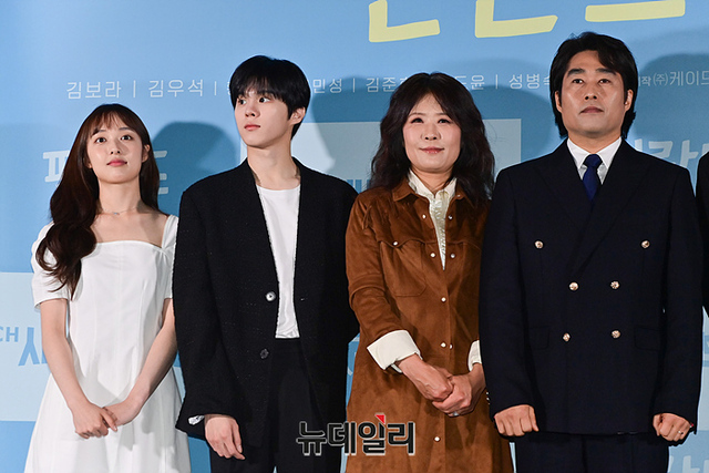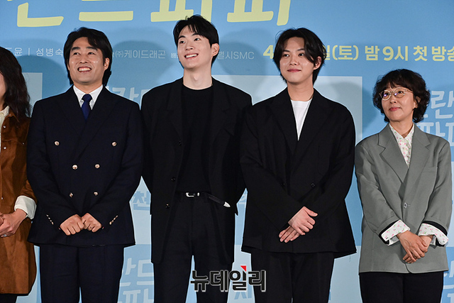 핀란드 파파 출연진들(왼쪽부터 배우 김보라, 김우석, 황석정, 정민성, 김준호, 장도윤)과 원영진 작가가 19일 오전 서울 성동구 메가박스 성수점에서 열린 드라마 '핀란드 파파' 제작발표회에서 포토타임을 갖고 있다.