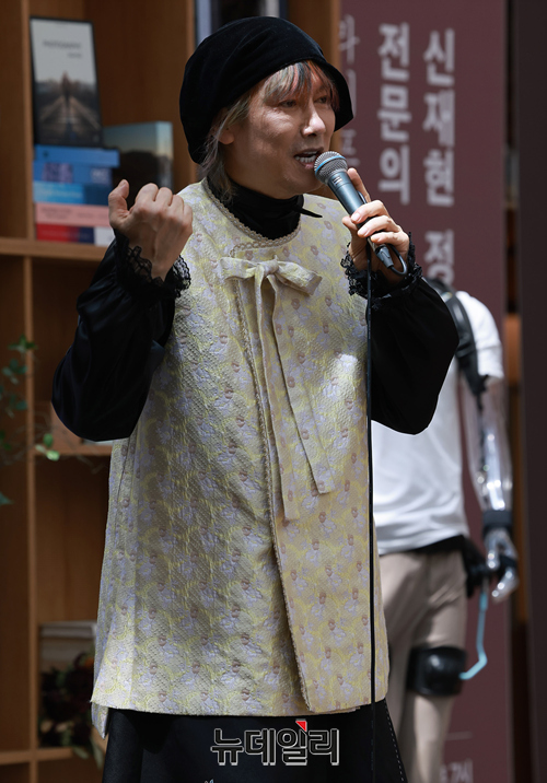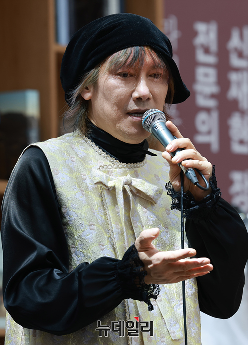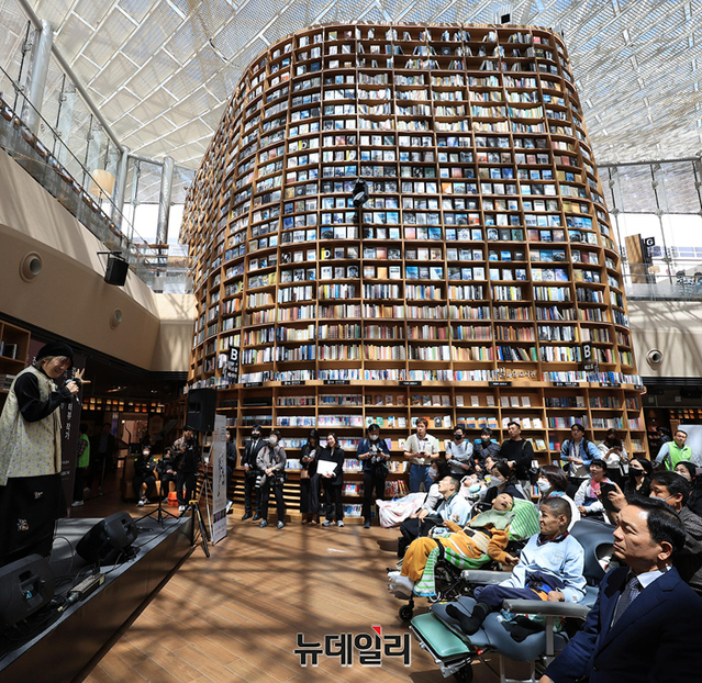 가수 김장훈이 장애인의 날을 앞둔 19일 오후 서울 강남구 별마당도서관에서 열린 '누워서 보는 콘서트'에서 인사말을 하고 있다.