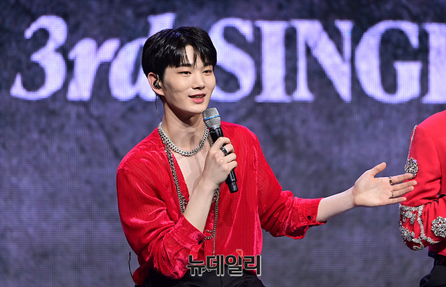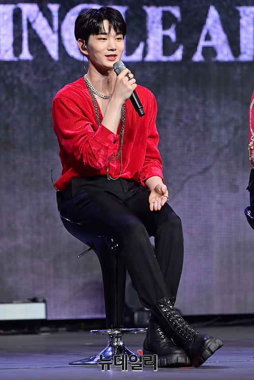 보이그룹 드리핀(DRIPPIN)주창욱이 19일 오후 서울 용산구 블루스퀘어에서 열린 세 번째 싱글앨범 '세븐 신스(SEVEN SINS)' 쇼케이스에서 취재진의 질문에 답하고 있다.