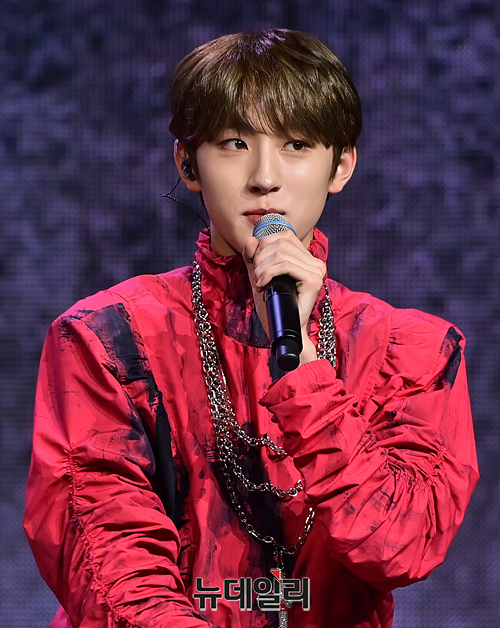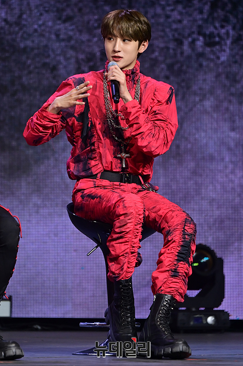 보이그룹 드리핀(DRIPPIN) 김민서가 19일 오후 서울 용산구 블루스퀘어에서 열린 세 번째 싱글앨범 '세븐 신스(SEVEN SINS)' 쇼케이스에서 취재진의 질문에 답하고 있다.
